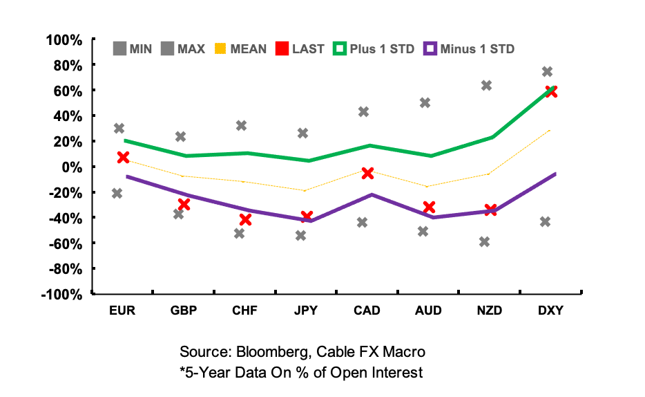 This week saw the largest moves in % of open interest in CAD and AUD, the former paired back its net short and the latter extended bets against the currency. CAD is within its 5-year average as shown in the first graph, while AUD nears its 1-std dev band.